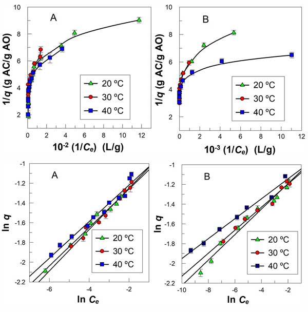 在不同的活性炭量下,評(píng)估了溫度(T=20–40°C)對(duì)沒食子酸和沒食子酸丙酯吸附過程的影響。實(shí)驗(yàn)吸附平衡數(shù)據(jù)擬合到兩個(gè)等溫線模型,Langmuir和Freundlich方程,并評(píng)估了擬合優(yōu)度。圖2。在研究的交流范圍內(nèi)獲得了非線性圖。因此,結(jié)果表明該模型不適用于描述沒食子酸和沒食子酸丙酯在活性炭上的吸附。注意,在任何給定的活性炭質(zhì)量下,溫度的變化都會(huì)導(dǎo)致沒食子酸和沒食子酸丙酯的吸附能力發(fā)生非常小的變化,差異小于2%。