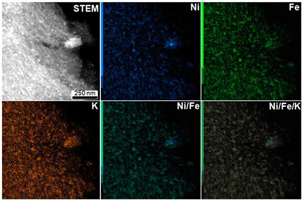 進行EDX映射以獲得有關(guān)顆粒的局部化學組成的更多信息。作為示例,圖2呈現(xiàn)了活性炭載鎳材料的EDX映射。如觀察到的圖2中,鎳和鐵,還鉀的存在下,在該材料檢測。這三種金屬的EDX映射的疊加顯示出完美的匹配,表明納米粒子結(jié)構(gòu)中存在所有這些金屬。除小顆粒外,還觀察到一個位于碳末端的大顆粒,并且鎳比其他金屬富集。對于活性炭載銅和銦在顆粒結(jié)構(gòu)中也發(fā)現(xiàn)了鉀的存在。