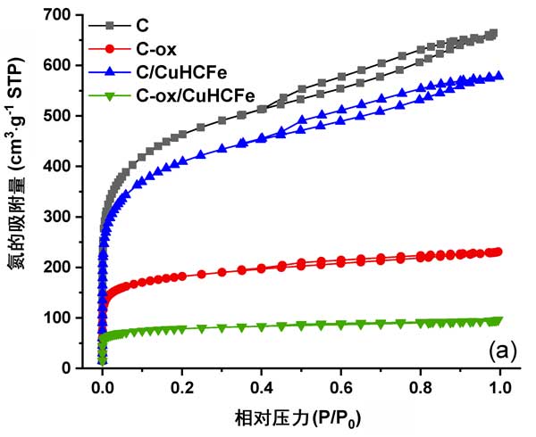 這些樣品的氮吸附等溫線和孔徑分布如圖3所示。。盡管活性炭和活性炭負載過渡金屬樣品的等溫線是I/IV型,結(jié)合了微孔和中孔性,但很難觀察到這些曲線的中孔部分,而活性炭負載過渡金屬樣品的等溫線幾乎消失了,說明了中孔性。該觀察結(jié)果與孔徑分布曲線一致,進一步顯示了孔徑和尺寸的減小。另外,我們注意到,在兩種情況下,過渡金屬銅相的引入均導致窄的孔徑分布。這可能表明活性炭孔中存在一些顆粒。多孔性的降低和氧官能團濃度的增加可能會影響銫的吸附性能。