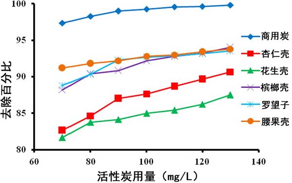 研究了用量對幾種農(nóng)業(yè)材料制成的活性炭和商用活性炭上天青A去除程度的影響;钚蕴亢蜕逃没钚蕴咳コ烨郃的百分比隨吸附劑劑量的增加而增加(圖2)。這可能是由于表面活性部位的可用性增加所致。