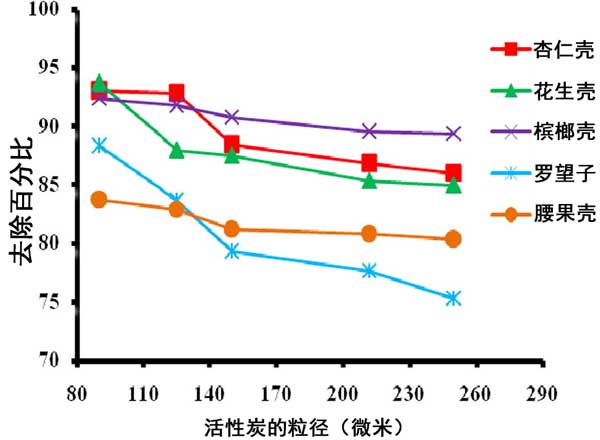 圖3:天青A粒徑變化對各種活性炭的影響。
