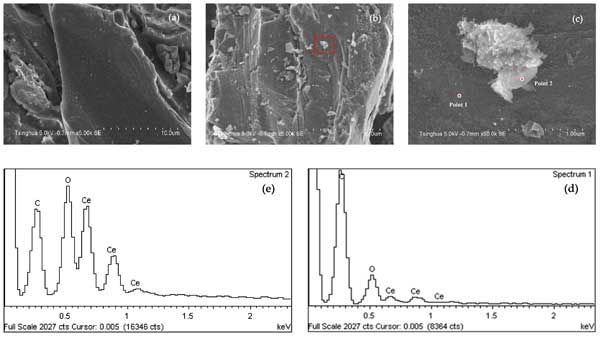 圖1: SEM和EDS分析結(jié)果:(a)酸洗活性炭的SEM,(b,c)負(fù)載鈰的活性炭的SEM,(d)點1的EDC,(e)第2點的EDS。