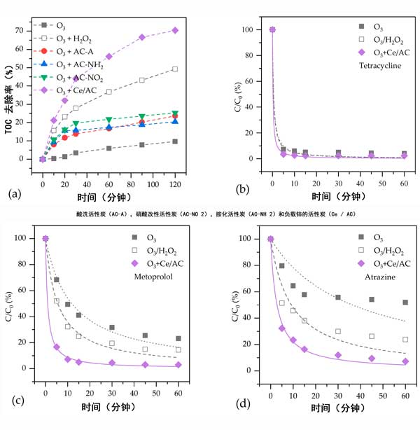 由于其可用性和可靠性,反滲透工藝已廣泛應(yīng)用于城市廢水處理廠中的水再生利用;厥75-85%的給水時,會同時產(chǎn)生反滲透濃縮液,其中含有高濃度的鹽和有機(jī)物。此外,還含有各種新興污染物,如果將反滲透濃縮液直接排放到水生環(huán)境中,,盡管這些有機(jī)物的濃度較低,也會會造成嚴(yán)重的環(huán)境危害。在本研究中,制備了酸洗活性炭,硝酸改性活性炭,胺化活性炭和負(fù)載鈰的活性炭。研究了這些活性炭在反滲透濃縮液中臭氧化有機(jī)化合物的性能。提出了一種可能的機(jī)制,用于水中有機(jī)化合物的催化臭氧氧化。