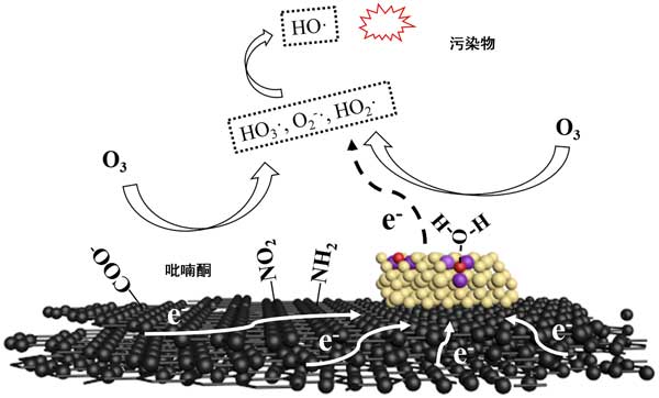 負(fù)載鈰的活性炭在臭氧氧化中可以很好的去除有機(jī)物,這主要是由于其各種去除機(jī)理,包括吸附,臭氧氧化和自由基氧化。吸附和臭氧化都是選擇性的。一些有機(jī)物在活性炭上緩慢吸附,因此非選擇性的羥基自由基氧化對于通過負(fù)載鈰的活性炭催化的臭氧氧化作用從水中去除難處理的有機(jī)化合物起著重要的作用。催化臭氧化系統(tǒng)中生成·OH的可能機(jī)理如圖3所示。通過這種機(jī)制,不僅可以通過表面官能團(tuán)而且可以通過負(fù)載在活性炭上的鈰來刺激·OH的生成。由表面基團(tuán)的自由基激發(fā)依靠其堿度和給電子效應(yīng)。對于負(fù)載在活性炭上的鈰,氧化鈰表面的氧空位是催化活性位。ø 3可以具有氧空位或直接用H反應(yīng)2 ö將其吸附在氧空位,以產(chǎn)生HO 3·,·O2 2-,HO 2·等自由基。這些自由基可以通過一系列鏈反應(yīng)轉(zhuǎn)化為·OH。在自由基生成過程中,氧空位周圍的Ce 3+會失去電子,并被氧化為Ce 4+,這可能導(dǎo)致催化活性降低。因此,富電子結(jié)構(gòu)(例如石墨烯層,-NO 2和吡喃酮)與氧化鈰之間可能發(fā)生電子轉(zhuǎn)移過程,從而導(dǎo)致Ce 4+的還原和催化活性的更新。這種協(xié)同效應(yīng)可能是在負(fù)載鈰的活性炭表面快速連續(xù)產(chǎn)生·OH的關(guān)鍵。