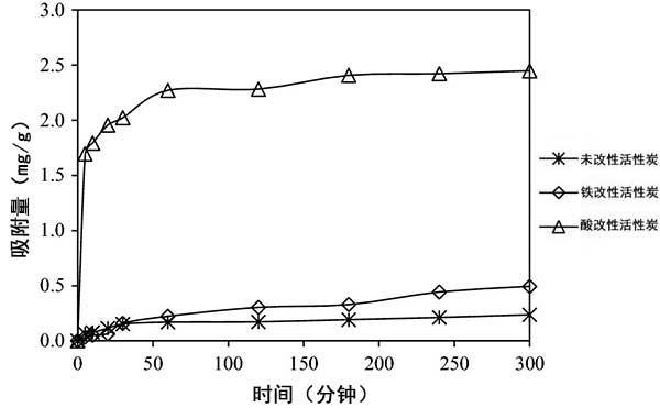 吸附動(dòng)力學(xué)主要用于確定吸附過程的保留時(shí)間。圖3顯示了砷離子在活性炭纖維上的吸附動(dòng)力學(xué)。如圖3所示 ,砷離子的吸附隨著接觸時(shí)間的增加而增加,并且考慮到處理效率,吸附平衡時(shí)間固定為60分鐘。與活性炭的吸附過程相比,F(xiàn)e和HNO 3改性后的活性炭吸附平衡時(shí)間增加,但在300分鐘時(shí)的吸附容量分別為0.236 mg/g,0.493 mg/g和2.45 mg/g。因此,鐵改性的活性炭提高了去除砷離子的吸附能力。