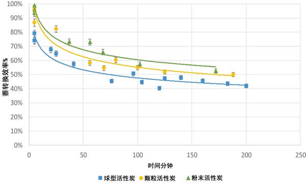 圖3報告了在測試過程中三種粒徑的活性炭萘轉化的時間演變,表明轉化效率的連續(xù)降低與有效表面積的逐漸減小有關。結果用誤差條表示,表明標準偏差,表明活性炭顆粒和粉末的行為相當相似,而活性炭顆粒始終顯示出較低的轉化效率,達到10%或更高。這表明較小的顆粒意味著降低的擴散阻力。