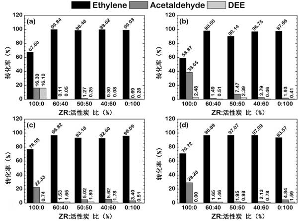 因此,提到在包含高達(dá)50wt%的活性炭的雙載體體系中發(fā)現(xiàn)的乙烯回收率的提高是由于來自活性炭的碳原子對催化劑的電子作用。另外,由于通過焦化的失活,大量的活性炭將導(dǎo)致乙烯回收率的降低,這是在高溫下與含碳反應(yīng)物的反應(yīng)中發(fā)現(xiàn)的常見的失活方案。這種失活導(dǎo)致活性位點(diǎn)的阻塞,降低了活性位點(diǎn)的數(shù)量,導(dǎo)致催化劑的總轉(zhuǎn)化率降低。