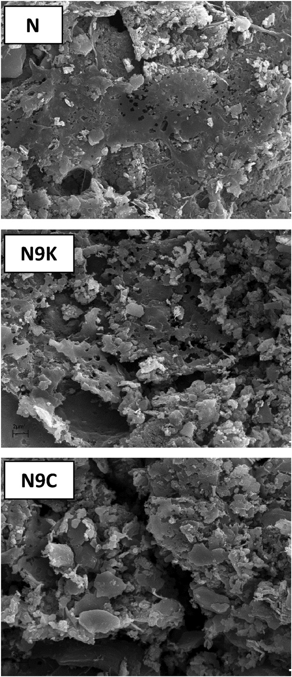 活性炭和經(jīng)改性后獲得的樣品的化學成分。兩種修飾均導致灰分含量以及結(jié)構(gòu)中特定元素的變化,其中這些變化對N9K樣品而言更大。起始活性炭(N)暴露于碳酸鉀會導致礦物質(zhì)(灰分)的顯著下降,同時氫含量下降兩倍(可能是碳結(jié)構(gòu)芳構(gòu)化的結(jié)果)由于活性炭顆粒的表面氧化,增加了氧氣量。還值得注意的是,灰分含量比在CO 2中退火的N9C樣品低了近10倍。大氣層。N9K中的灰分很可能是由于活化后將其用5%的鹽酸溶液洗滌而導致的。圖1所示的SEM圖像也證實了各個活性炭的質(zhì)地和形態(tài)多樣性?梢钥闯觯鶕(jù)制備程序,樣品在尺寸,形狀以及孔的數(shù)量或排列方面存在顯著差異。特別是在活性炭和N9C樣品中可以觀察到的較亮片段可能是其結(jié)構(gòu)中存在灰分(礦物質(zhì))的結(jié)果。
