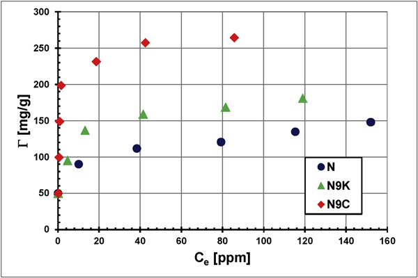 在圖3中比較了初始濃度為100 ppm的活性炭,N9K和N9C表面上初始濃度為100 ppm的聚合物溶液中PAA(Γ)的吸附量。。可以看出,對于所有檢查的活性炭,觀察到隨著pH升高聚合物吸附明顯減少。這是由于所檢查系統(tǒng)中的靜電條件從有利的吸引條件(在較低的pH值)變?yōu)椴焕呐懦鈼l件(在較高的pH值)而引起的。而且,在更酸性的環(huán)境中,聚合物鏈的盤繞構(gòu)型使得吸附層的堆積更為緊密(高PAA吸附)。在較高的pH值下,PAA鏈發(fā)展的增加導致表面層中吸附的大分子的構(gòu)型更加延長,其特征是聚合物鏈段的堆積密度顯著降低(PAA吸附低)。