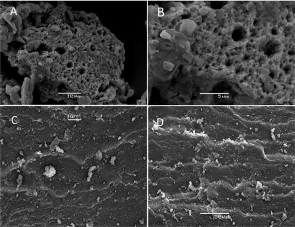 圖1:A、B活性炭,C、D煤的SEM顯微照片。