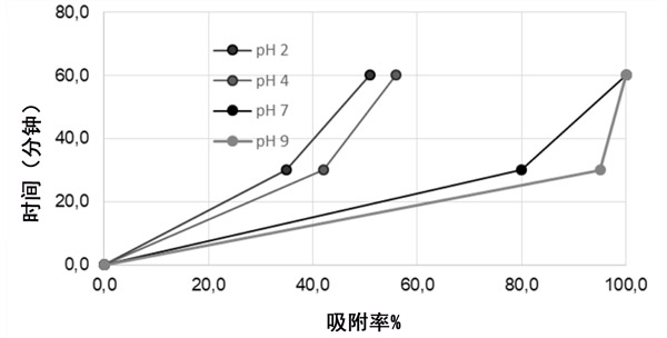 研究了pH值對(duì)三甲胺在活性炭上吸附的影響。在該過程中,發(fā)生吸附現(xiàn)象的溶液的pH值是非常重要的參數(shù),尤其是在三甲胺為布朗斯臺(tái)德堿的情況下。在官能團(tuán)和吸附劑表面之間產(chǎn)生的靜電荷的大小主要取決于介質(zhì)的pH。在pH值為2、4、7和9的情況下,用0.200g的活性炭測(cè)量了在0、30和60分鐘時(shí)三甲胺的吸附百分比,結(jié)果總結(jié)在圖3中。