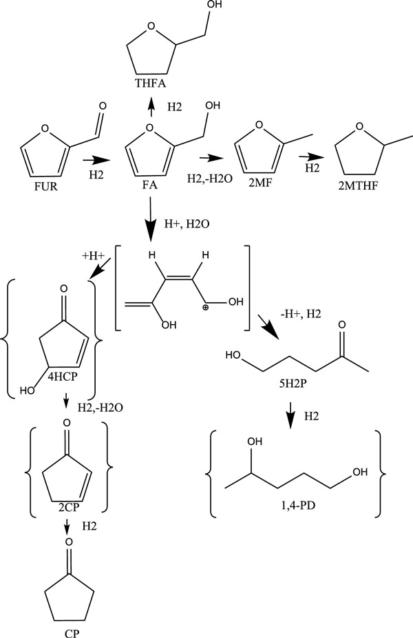 在下一組實(shí)驗(yàn)中,確定了液體停留時(shí)間對(duì)糠醛加氫超過0.8%活性炭催化劑的影響(H 2氣流保持恒定在100 mL/min)?啡┺D(zhuǎn)化率隨著液時(shí)空速的增加或停留時(shí)間的縮短而下降,碳封閉率在74%至100%之間。溫度,壓力和液體停留時(shí)間效應(yīng)研究的結(jié)果表明,活性炭催化劑主要通過糠醛促進(jìn)了糠醛中糠醇和2-甲基呋喃的形成,并通過推測(cè)性反應(yīng)途徑促進(jìn)了環(huán)戊酮和5-羥基-2-戊酮的少量形成,需要對(duì)酮進(jìn)行酸催化)形成(圖3)。