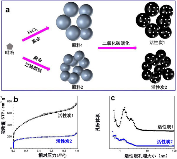 圖1和一個示出了活性炭材料的制備方法。首先,使用不同的氧化劑(FeCl 3和過硫酸銨)通過吡咯單體的氧化聚合反應(yīng)合成了兩種樣品。其次,對原材料進行二氧化碳活化處理,以制備具有高孔隙率的活性炭。進行氮吸附測量以獲取關(guān)于他們的比表面積的數(shù)據(jù)。