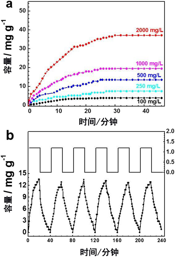 圖3:(a)在不同的NaCl濃度下活性炭的電吸附動力學(xué),(b)活性炭電極在NaCl電解質(zhì)中的電吸附和再生循環(huán)。