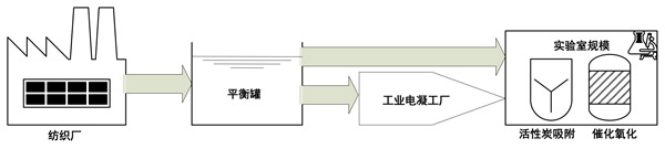 來自紡織廠的紡織廢水被存儲在均衡罐中,并轉(zhuǎn)移到工業(yè)規(guī)模的電凝處理廠。此后,如圖1所示,在實驗室中進行了催化臭氧氧化,然后進行了吸附階段。單次吸附:在催化臭氧氧化之前,對于所有催化劑,吸附實驗均進行了30分鐘。將活性炭催化劑直接添加到廢水中。吸附在與臭氧化處理相同的反應(yīng)器中進行,但沒有臭氧入口以維持均勻的實驗條件。所有實驗條件與臭氧化處理期間相同。溫度保持穩(wěn)定并且等于23±1℃。活性炭催化臭氧化:使用與吸附和臭氧化相同的反應(yīng)器進行催化臭氧化。所有實驗條件與臭氧化處理期間相同。對于所有催化劑,每次催化劑濃度為0.5g/L。反應(yīng)后,進行催化劑的過濾(0.45μm過濾器)。