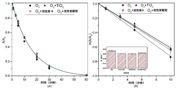 圖2:使用三種類型的催化劑(a)和擬除色率(b)進行臭氧氧化和催化臭氧氧化處理期間的原始(未經(jīng)預(yù)處理)工業(yè)廢水。