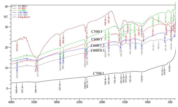 對于峰的強度,活化溫度在降低強度中起重要作用。較高的溫度將產(chǎn)生具有較少官能團的活性炭。最高活化溫度樣品顯示幾乎平坦的光譜。同時,對于活化劑定量,效果很小。比率從0.5增加到1.5似乎對樣品的化學(xué)性質(zhì)沒有任何影響,因為三個光譜相似。