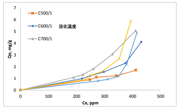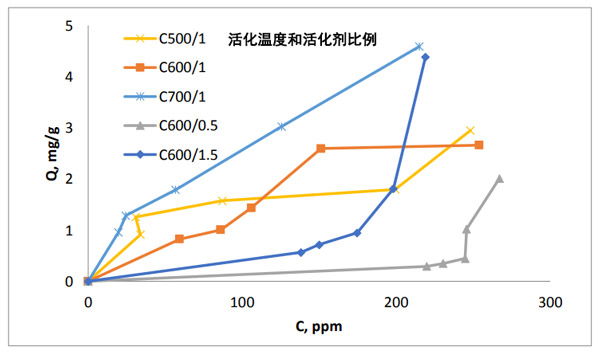 從圖2中可以看出,活性炭在不同的活化溫度(500℃,600℃和700℃)和活化劑比率(0.5、1.0和1.5)下的鋰吸附等溫線。似乎在較低濃度下吸附能力相對較低。這表明鋰離子對活性炭表面的親和力低。高濃度下容量的增加與孔隙率成正相關(guān);钚蕴康妮^大表面積傾向于更多地吸附鋰離子。在等溫線的分類中,該等溫線被認為是III型等溫線,對于無孔或大孔吸附劑來說是典型的。因此,鋰離子似乎不附著在微孔內(nèi)部,而是附著在外部和大孔表面;钚蕴繉︿囯x子的親和力低。炭表面的碳原子與溶液中的鋰離子之間的低相互作用可能是由于離子的原子質(zhì)量低所致。原子間勢相互作用表明該力與相互作用原子的原子質(zhì)量以及原子之間的距離具有正相關(guān)。