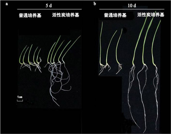 圖1:圖像顯示在活性炭或普通培養(yǎng)基中生長(zhǎng)5天(a)或10天(b)的小麥幼苗。