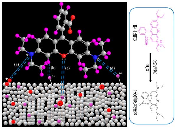 羅丹明B降解機理示意圖。活性炭的表面上存在幾個官能團,它們可以與羅丹明B染料分子相互作用?赡艿南嗷プ饔煤喪鋈缦拢(a)活性炭的–COOH基團與羅丹明B的負電性基團之間的相互作用,(b)活性炭的–OH基團與羅丹明B的芳環(huán)之間的氫鍵,(c)氫鍵活性炭的–OH基團與羅丹明B的x噸基團之間存在(d)活性炭和羅丹明B染料分子的表面官能團之間的靜電相互作用。