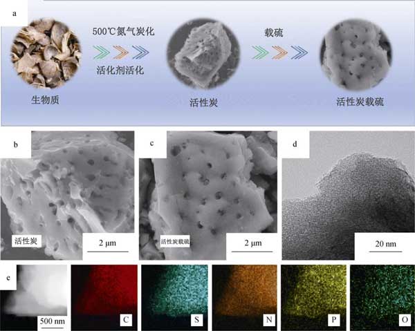 首先,除去生物質(zhì)的污垢和表面雜質(zhì),用清水徹底清洗活性炭原材料,然后用蒸餾水反復(fù)清洗,然后將它們粉碎成碎片,然后在烤箱中100°C下干燥。為了進(jìn)行預(yù)碳化,將干燥的生物質(zhì)在氮?dú)夥障碌恼婵展苁綘t中在500°C的溫度下熱解2小時,以去除少量有機(jī)分子。隨后,為了通過化學(xué)活化提高比表面積,將預(yù)碳酸化的生物質(zhì)以1:4的重量比浸入作為化學(xué)活化劑的水溶液中,然后充分?jǐn)嚢?小時以確保完全滲透。之后,將混合物在N 2下于900°C退火1小時。最后,用鹽酸反復(fù)洗滌退火后的樣品,然后用過量的蒸餾水沖洗以獲得中性pH。最終樣品通過在80°C的空氣中干燥獲得,并標(biāo)記為多孔活性炭。相比之下,使用相同步驟制備的未添加活化劑的產(chǎn)品被標(biāo)記為無孔活性炭。接著使用這兩種活性炭升級成加硫復(fù)合材料,將升華后的硫(純度>99.95%)和相應(yīng)的活性炭粉末(重量比為60:40)充分混合并在研缽中研磨。然后,將獲得的混合物用特氟隆容器密封在高壓釜中。在155°C下熱處理12小時后,獲得了多孔摻硫活性炭和無孔摻硫活性炭復(fù)合材料。