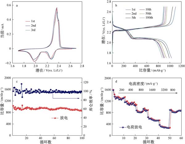 為了評估活性炭作為陰極的電化學(xué)性能,將鋰箔作為陽極組裝到鋰硫電池的紐扣電池中。用于第一,第二和第三個循環(huán)的循環(huán)伏安圖(CV)曲線上在0.05毫伏·秒的掃描速率的電位窗口進(jìn)行(圖2A)。在第一循環(huán)期間,觀察到兩個陰極峰在2.26和1.97 V,CV曲線中最初的幾個循環(huán)幾乎重疊,這表明循環(huán)穩(wěn)定性極佳,容量保持率相對較高;钚蕴康暮汶娏鞒潆/放電曲線和循環(huán)穩(wěn)定性的測試中,如在圖中所描述2B、C;钚蕴侩姌O的首次放電容量為1045 mAh·g -1,約為硫理論容量的62.5%。此外,活性炭電極在第100次循環(huán)時也顯示出869.8mAh·g -1的放電容量。如圖2d所示測量活性炭的倍率性能,在200–3200 mA·g -1下表現(xiàn)出1260、1050、806、513、290 mAh·g -1的可逆放電容量。此外,當(dāng)電流密度達(dá)到800 mA·g時,活性炭陰極的放電容量為802 mAh·g -1。多孔活性炭材料表現(xiàn)出中等的鋰硫電池電化學(xué)性能,顯示出高性能鋰硫電池的潛力。