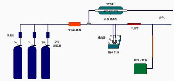 實驗裝置如圖1所示。使用單因素實驗研究活性炭劑量,氧氣含量和煙道氣流速對活性炭吸附的影響。將一定量的吸附劑放在15×150 mm的U形管中,并在混合氣流下(在恒定混合氣體中含有2000 ppm 二氧化硫,一定量的氧氣)在60°C的水中加熱。,并用氮氣平衡二氧化硫的量用便攜式煙氣分析儀分析廢氣中的廢氣。計算吸附劑活性炭的脫硫效率,從而確定了合適的吸附條件。