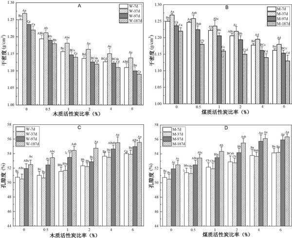 圖2:活性炭對(duì)植被混凝土干密度(A,B)和孔隙率(C,D)的影響。
