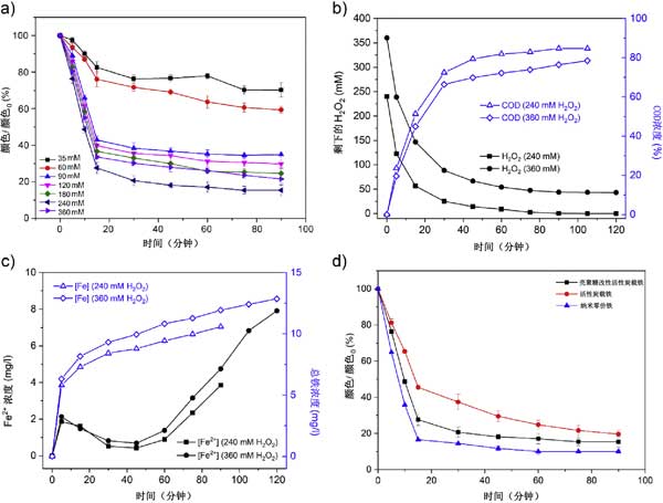 圖2:(a)活性炭處理的合成黑素廢水的脫色(C/C 0百分比),(b)在存在H2O的處理過程中,殘留H 2 O 2的濃度變化和活性炭的COD去除效率,(c)鐵離子的濃度變化和總鐵離子,(d)活性炭在相同載鐵量的條件下,三種催化劑在處理黑素廢水中的催化活性對脫色效果的比較。