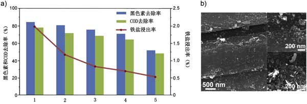 檢查了活性炭催化劑的可重復使用性,以評估其是否經過了多個循環(huán)的黑色素處理。圖3顯示了五個處理周期的COD和脫色以及鐵浸出的結果。一個。盡管觀察到4個循環(huán)后,脫色效率從85%逐漸降低到70%,但是,可以證明活性炭催化劑在Fenton反應中具有合理的可重復使用性。效率的降低可歸因于吸附降解副產物時某些催化劑位點的失活以及在Fenton反應過程中少量鐵的浸出。在每個循環(huán)后對鐵的浸出進行了研究,以表明活性炭的穩(wěn)定性。如圖3所示a,在第一個循環(huán)中浸出鐵離子的量最高,約為初始鐵量的2%。在第三個循環(huán)后,浸出鐵降至<1%,并且在隨后的循環(huán)中保持穩(wěn)定,在第五個循環(huán)時降至0.5%。與將鐵離子浸入溶液中的單獨的納米零價鐵相比,在Fenton類工藝中,亞鐵離子和鐵離子可能會被活性炭吸附/螯合,從而避免了浸出并使反應連續(xù)供入。零碎的鐵損失顯然是活性炭催化劑再利用以及減少鐵淤渣的重要步驟。