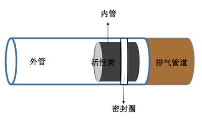 模擬的測試環(huán)境包含內(nèi)部和外部兩部分的試管進(jìn)行吸附。外管的長度為50cm,直徑為3.8cm。該管的功能是將排氣消聲器連接至氣體分析儀,而內(nèi)管則用作活性炭的儲存器。改變內(nèi)管的長度,以確定活性炭負(fù)載百分比對降低廢氣濃度的影響。直徑分別為3cm,4cm和5cm。管子之間有一個密封,以防止廢氣泄漏。管的結(jié)構(gòu)在圖1中進(jìn)行了描述。
