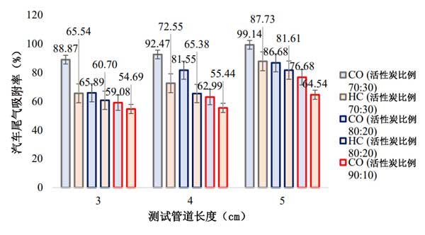 為了確定吸附管的長度對汽車尾氣中的CO和HC氣體排放吸附能力的影響。所用的活性炭是改性的。根據(jù)圖3所示的圖表,可以看出吸附管越長,CO和HC的吸附百分?jǐn)?shù)越高。這是因?yàn)槲矫娣e更長。吸附區(qū)域是活性炭與廢氣之間發(fā)生接觸的區(qū)域。吸附面積越寬,活性炭吸附的污染物氣體量就越大。因此,CO和HC的濃度將由于接觸面積而降低。