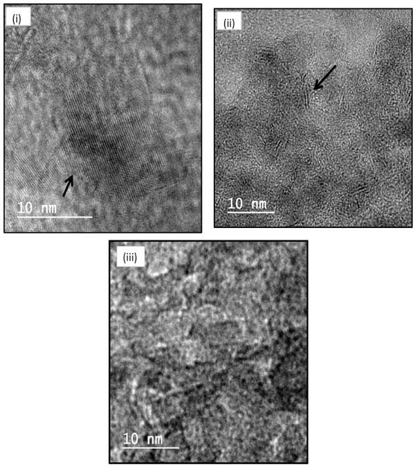 進行了鎳鉬硫化催化劑的TEM分析,以收集有關(guān)硫化鉬在載體上的分散性的信息。TEM圖像如圖1所示。對于氧化鋁和活性炭催化劑,在二氧化硅催化劑中未觀察到MoS 2條紋。氧化鋁催化劑中會明顯出現(xiàn)兩到三層MoS 2堆疊,可能是II型活性位。然而,這種類型的活性位點對于活性炭負載的催化劑是不可見的。氧化鋁催化劑的計算平均平板長度為3.19nm。較大的平均平板長度可能與氧化鋁催化劑中較弱的金屬-載體相互作用有關(guān)。