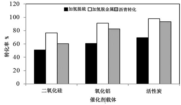 使用原油中的真空殘留物作為原料,在間歇反應器中評估了加氫處理活性。因為所有反應都是在幾乎相同的條件下進行的,所以轉(zhuǎn)化率的差異主要歸因于所用催化劑的性質(zhì)。原料的性質(zhì)包含高瀝青質(zhì)(22%),硫(5.45%)和其它金屬含量。在圖2中,已經(jīng)提出了不同催化劑的加氫處理活性,使用活性炭,二氧化硅和氧化鋁為載體的催化劑獲得的加氫脫硫轉(zhuǎn)化率分別為70%,58%和61%。負載在氧化鋁上的催化劑具有高的加氫脫硫轉(zhuǎn)化率。