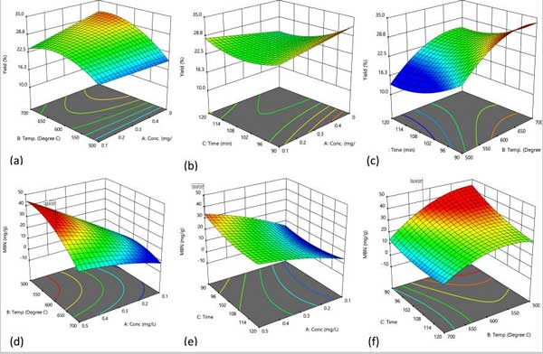 圖1:3-D圖顯示了(a、d)溫度和濃度(b、e)接觸時(shí)間以及濃度(c、f)接觸時(shí)間和溫度的相互作用對活性炭的百分收率和亞甲基藍(lán)數(shù)的影響。