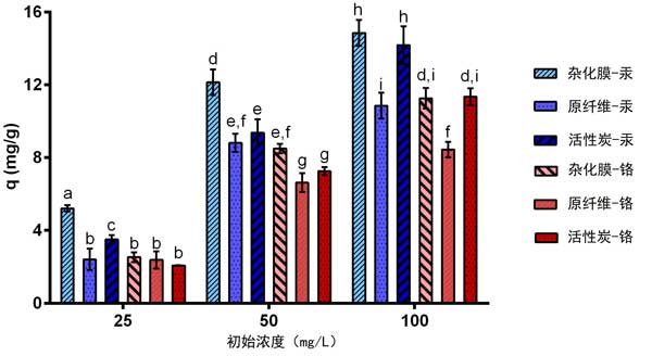 圖2:活性炭制備的雜化膜對汞(藍色條)和鉻(紅色條)的吸附能力。誤差線為標準偏差(n=3)。條上的不同字母表示基于最小顯著性差異(LSD)測試,p水平=0.05時不同處理之間的顯著性差異。