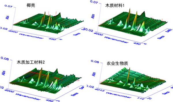 圖1:四種生物質(zhì)樣品熱解過程中氣態(tài)產(chǎn)物的3D FTIR吸收光譜。