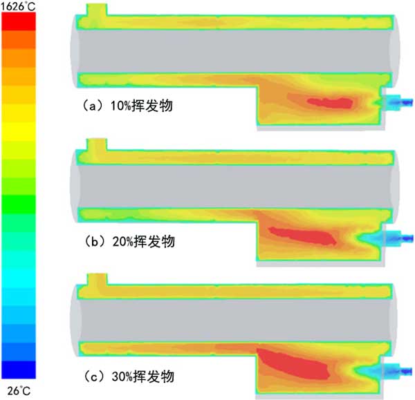 為了優(yōu)化反應(yīng)器的運行,使用流體力學建模來模擬揮發(fā)物的燃燒。該模型包括焦油的轉(zhuǎn)化以及活性炭和灰份的形成。模擬并比較了三種工作條件截面中的溫度分布特性顯示在圖3顯示。