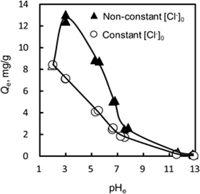 活性炭上的硝酸根離子吸附量與溶液的pH e之間的關系如圖1所示。硝酸根離子在堿性條件下幾乎不被吸附,這意味著氫氧根離子會抑制硝酸根離子的吸附。另一方面,隨著平衡pH的降低,硝酸根離子的吸附量增加。在堿性條件下,由于硝酸根離子與活性炭表面之間的靜電排斥,硝酸根離子很難被吸附在活性炭上。另一方面,硝酸根離子的吸附量在酸性條件下增加,這歸因于硝酸根離子與碳表面之間的靜電吸引力。然而,隨著平衡pH從3.0降低到2.0,觀察到硝酸根離子吸附的顯著降低。在此pH范圍內,氯離子的初始濃度從2 m增加到20 m M,這意味著共存的氯離子會抑制硝酸根離子的吸附。通過NaCl溶液將氯離子的初始濃度固定在20 m M時,可以清楚地發(fā)現(xiàn)氯離子對硝酸根離子的吸附抑制作用,表明硝酸根離子在所有pH區(qū)域的吸附量均低于沒有任何pH調節(jié)的溶液。因此共存陰離子會導致競爭吸附影響硝酸根離子吸附的效果,并且這種作用可能是較強的在共存陰離子的濃度較高。